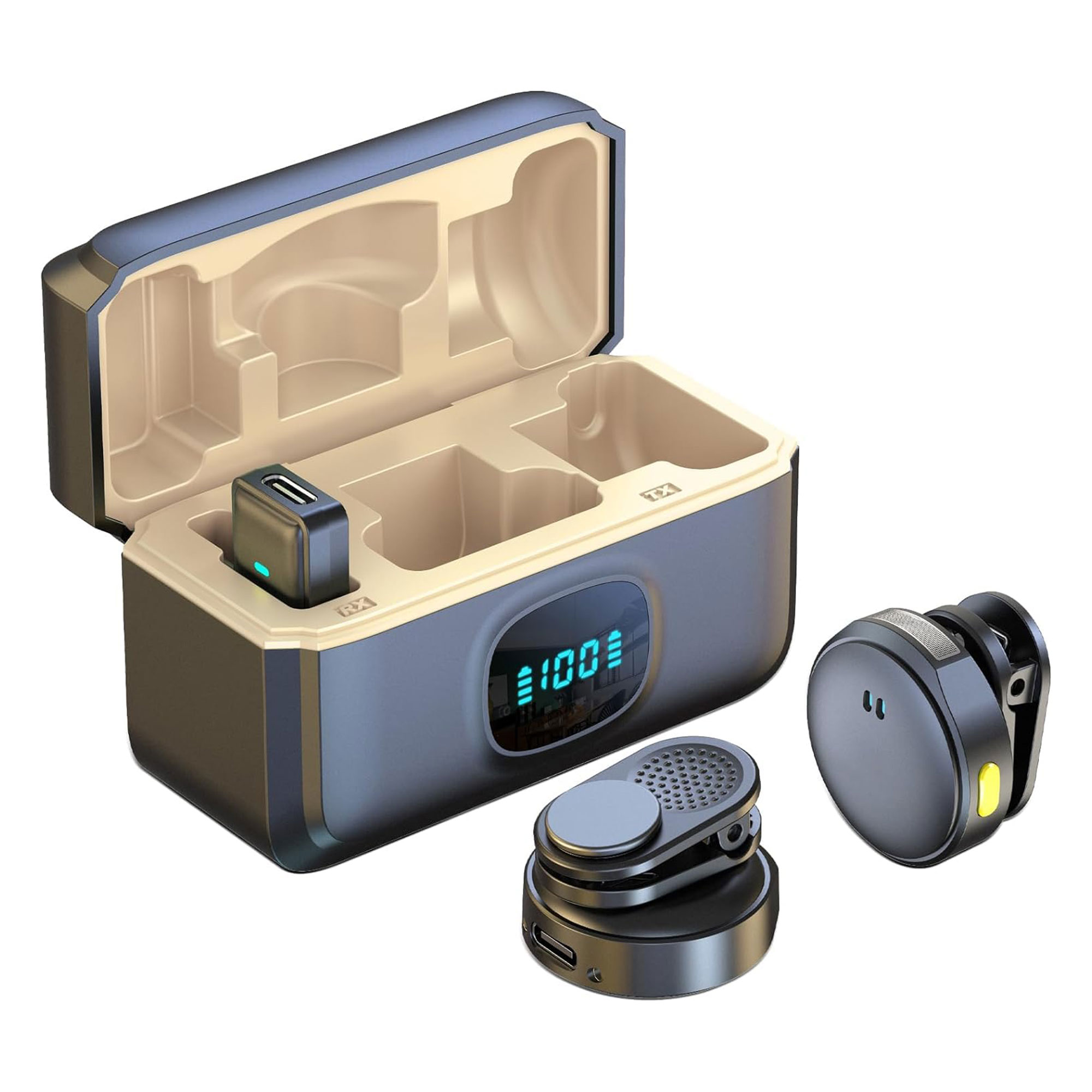 – علبة الشحن تقدر تشحن الميكروفون 5 مرات إضافية، ما يخليك جاهز دايمًا.